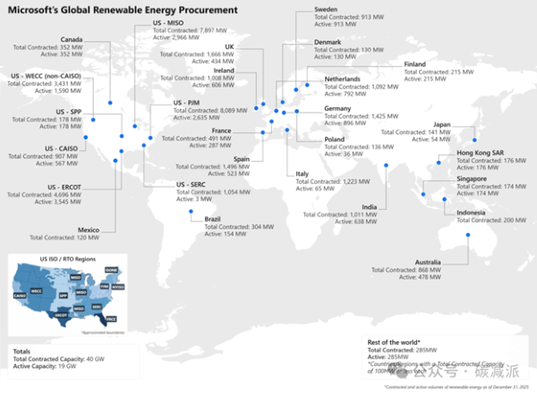 微軟清潔能源投資呈現高度全球化特徵。在歐洲,合約容量領先的國家包括英國,西班牙和德國;亞太地區則由印度,澳洲領先新增容量。這種跨區域採購不僅分散投資風險,也加速不同階段能源轉型市場的清潔電力部署。
